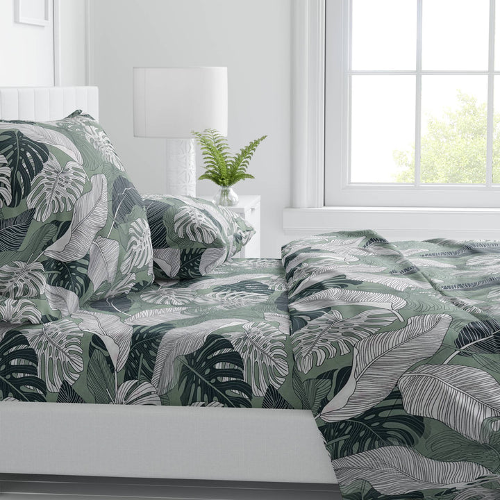 Bring nature indoors with Jungle Whisper, featuring oversized tropical leaves in muted green tones. This 100% cotton fitted bedsheet is perfect for adding an earthy, contemporary flair while ensuring a cozy, breathable sleep experience.
