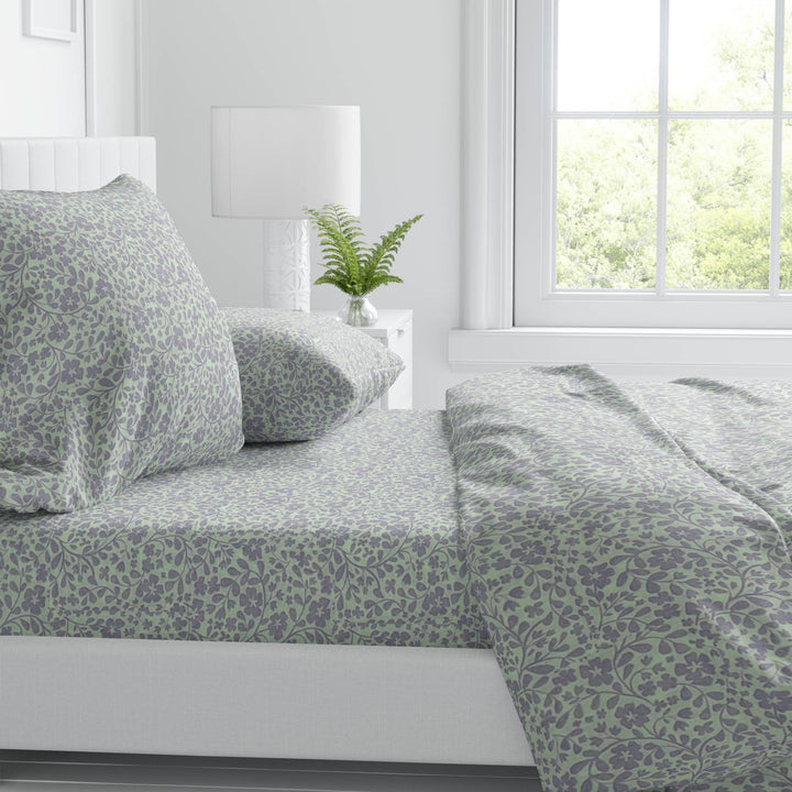 Delicate floral vines flow across a soft lavender background in Lavender Veil, evoking a sense of calm and charm. This 100% cotton fitted bedsheet offers breathable comfort and a whimsical aesthetic, perfect for cozy mornings and tranquil nights.